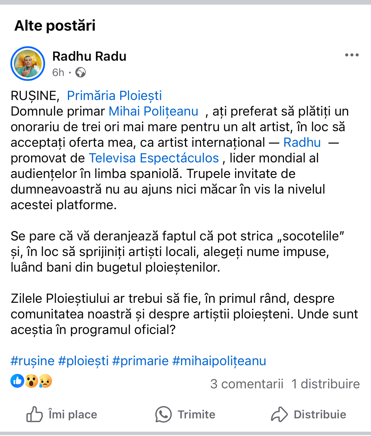 Și să trecem la marea durere: Zilele Ploieștiului. Ar fi trebuit să fie despre comunitate, despre artiștii locali, despre mândria prahoveană. Dar ce faci tu, Mihai? Îi lași pe artiștii noștri să cânte în garaj, în timp ce torni banii noștri în spectacole care nu ne reprezintă. Unde e Radhu în programul oficial? Unde sunt talentele locale? Sau poate crezi că ploieștenii preferă să tremure de frig la iarnă, dar să se încălzească la un concert scump plătit din buzunarul lor? Genială strategie, ce să zic!