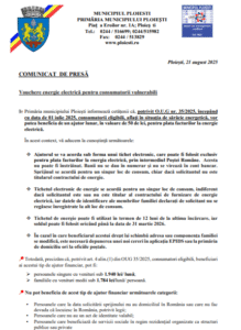 Prin intermediul unui comunicat, Primăria Ploieşti a anunţat ieri, 21 august, că începând cu 1 iulie 2025, consumatorii vulnerabili din Ploiești – și din toată țara – pot beneficia de un sprijin financiar lunar pentru plata facturilor la energie electrică. Măsura este reglementată prin Ordonanța de Urgență nr. 35/2025 și constă în acordarea unui voucher lunar de 50 de lei, sub formă de tichet electronic, destinat exclusiv achitării energiei electrice prin Poșta Română.