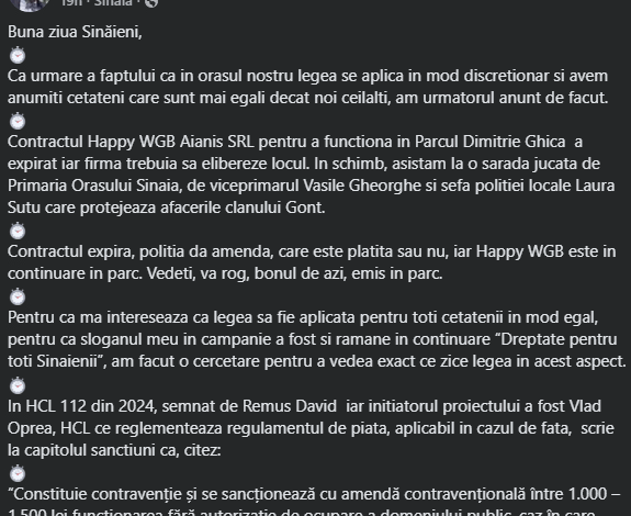 Pe pagina sa de Facebook, un consilier local din Sinaia trage un semnal de alarmă cu privire la nerespectarea legii în cazul firmei Happy WGB Aianis SRL, care continuă să funcționeze ilegal în Parcul Dimitrie Ghica, după expirarea contractului de ocupare a domeniului public. Potrivit acestuia, deși există o hotărâre de consiliu local (HCL 112/2024) ce prevede confiscarea imediată a bunurilor în astfel de cazuri, autoritățile locale – inclusiv viceprimarul Vasile Gheorghe și șefa Poliției Locale Laura Șuțu – ar proteja afacerile firmei.