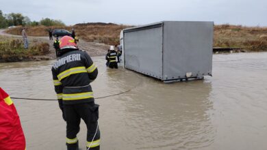 Șofer blocat cu mașina în râul Teleajen! Intervenție dramatică a pompierilor militari din Ploiești!